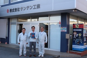 同社は、公共施設をはじめ多岐にわたる建物の電気設備工事の設計・施工・管理を行っており、代表取締役である鹿内さん、社員の片桐さん、加藤さんは地元の団員として災害が発生するといち早く現場に駆け付け、休日には地域イベントなどにも積極的に参加し、防災に関する啓発活動や消防団員の勧誘、訓練などを日々行っていただいております。