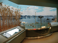 Scenic Tega Lake is home to many species of birds. Exhibitions in this room depict the four seasons of the Lake and its wild inhabitants. The large scene shows the Lake in mid-winter, with various ducks and diving birds. Three smaller dioramas depict rice paddies during the transplanting season; reed beds in summer; and a sand bar in late autumn.