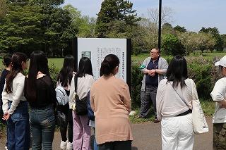 気象台記念公園の成り立ちについて説明を受ける学生たち