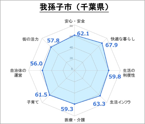 我孫子市の総合スコアは62.7(1位の千代田区は70.1)。