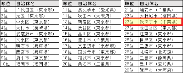 同ランキングにおいて、我孫子市は全国では世田谷区とならび23位、関東エリアでは14位にランクインしました。我孫子市がランクインしたのは、2017年の調査以来初めてです。