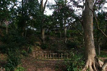澤の家の前で遊歩道がぐるっと角度を変えたら、左側の斜面の上を見てください。四角い石があるのがわかりますか?これは、この場所に安置されていた観音像の礎石に使われていた石です。観音像は、残念ながら戦後盗難にあって残っていませんが、母親思いの楚人冠が、澤の家で暮らしていた母から観音像がよく見える場所を選んだという位置関係が確認できます。