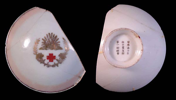土坑から出土しました。表に日本赤十字社の社紋が描かれており、