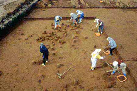発掘風景です。出土した石器の周辺をジョレンで掻いている様子です。