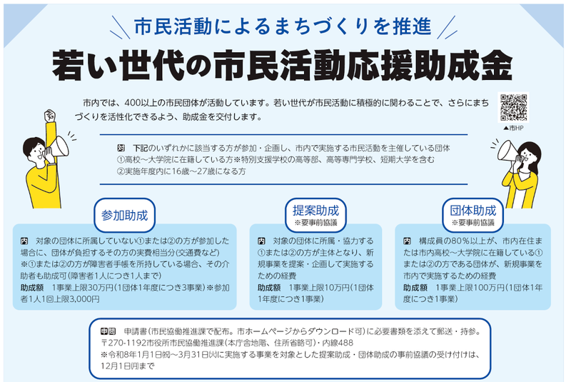 市民活動団体によるまちづくりを推進するために、若い世代の市民活動への参画を促進することを目的として、団体に助成金を交付する制度です(※個人に対する交付ではありません)。