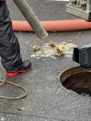 左の写真は、油が汚水管内で凝固し詰まりが発生した箇所です。