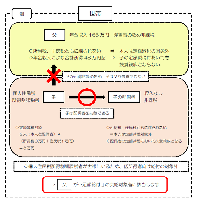例)所得税・住民税所得割が課されない(公的年金収入などが158万円超、概ね170万円以下)65歳以上の高齢者が納税者である息子等と同居している場合