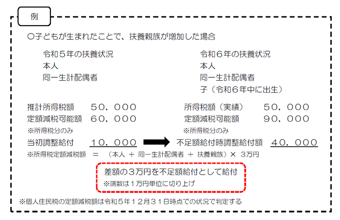 A こどもが生まれることなどの扶養親族の数が増えたことにより、令和6年夏以降に市区町村から支給された当初給付額に不足があることが判明した場合は、令和7年の不足額給付において、差額が給付されることになります。