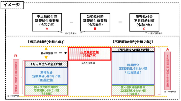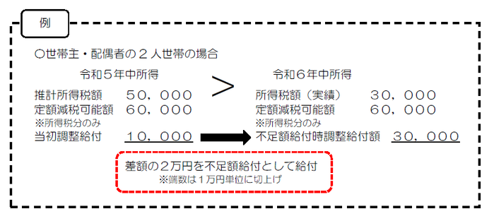 そのため、令和6年分所得税及び定額減税の実績額等が確定したのちに、本来給付すべき金額と、令和6年度当初調整給付額との間で差が生じた場合、「定額減税補足給付金(不足額給付)」の給付を行います。