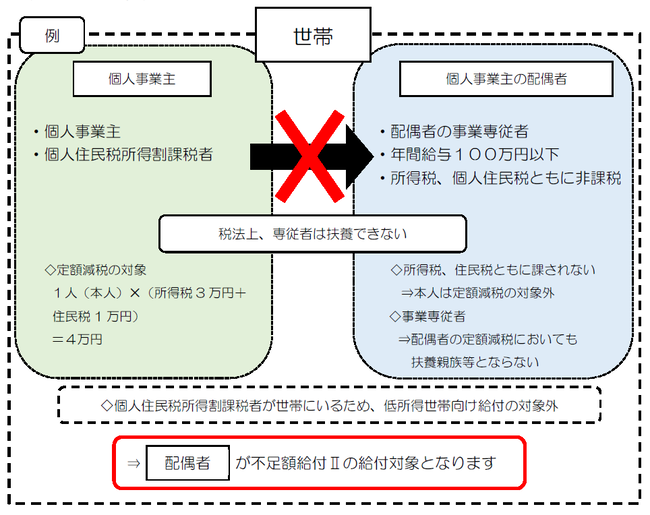 A 所得税、個人住民税所得割の税額がないことによって本人としての定額減税が受けられず、扶養親族等としての定額減税の対象にも制度上含まれない事業専従者の方については、1人あたりの不足額給付は原則4万円としています。