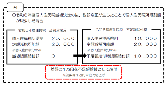 当初調整給付後に税額修正が生じたことにより、令和6年度分個人住民税所得割額が減少し、都度対応ではなく、不足額給付時に一律に対応することとした方