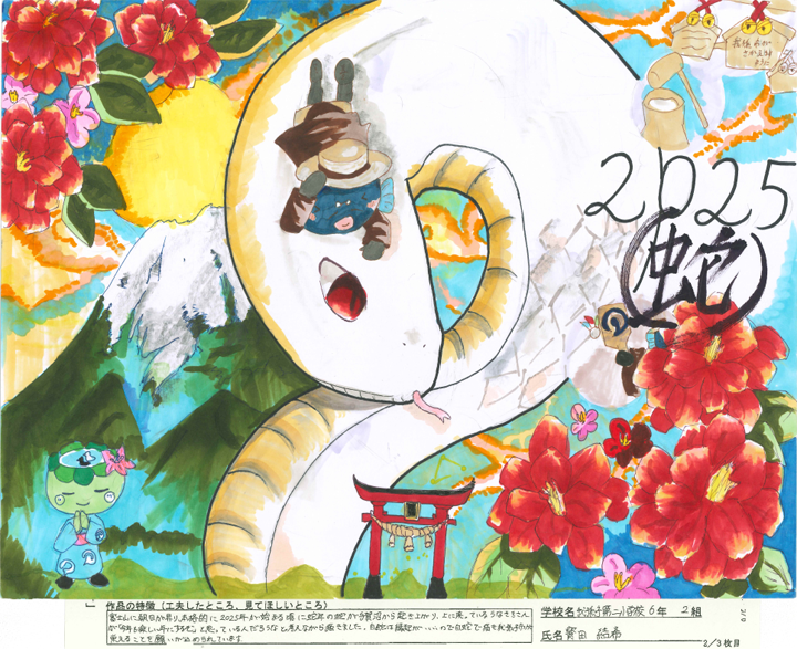 朝日が昇る富士山をバックに、大きな力強いヘビが起き上がり「楽しい年にするぞ」という、うなきちさんの思いが伝わってきます。四隅の赤い花や絵馬、祈るあびかちゃんなど、細かな点にも気が配られ楽しい作品となっています。