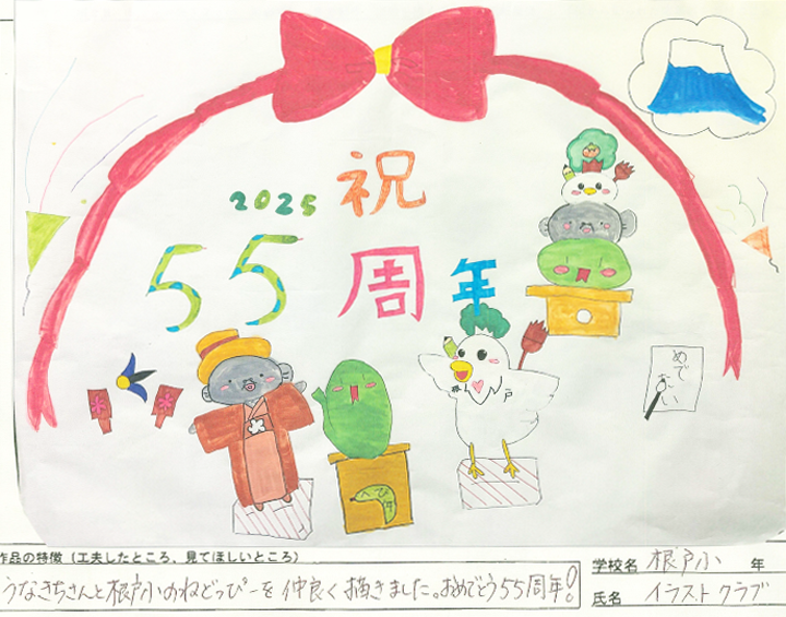 くす玉が開き、お正月の明るい雰囲気が伝わってくる作品ですね。うなきちさんと根戸小のキャラクター「ねどっピー」が仲良しで、温かな感じがあり、「イラストクラブ」の人たちの頑張りが表れています。今年もみんなで頑張ることができるといいですね。