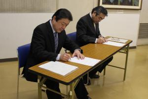 宣言文に署名する市長、副市長