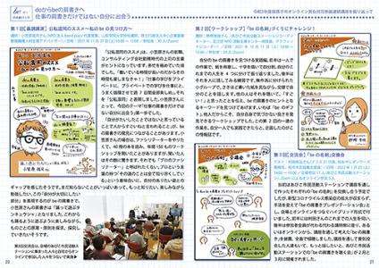 この情報誌は書き込み式のノートページが中心ですが、作成の元となったオンライン連続講座の概要を紹介したページもあります。講座全体の内容を第2回講師の野際里枝さんがグラフィックレコードでまとめてくれました。グラフィックレコード(グラレコ)は、ミーティングや講演の内容を、文字だけでなく図やイラストで記録する手法で、紙やホワイトボードに書く時、ビジュアルに楽しくまとめることで、参加者が視覚的に共有できます。