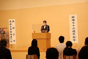 昭和25年8月6日と9日に広島と長崎に原爆が落とされてから76年が過ぎた8月14日に、平和祈念式典を開催しました。今年の平和祈念式典は悪天候のため、手賀沼公園平和の記念碑前からアビスタの多目的ホールに場所を変えて行いました。星野市長は式辞の中で、原爆並びに先の大戦で犠牲となった方々のご冥福をお祈りするとともに、「今後も、平和都市宣言をしている自治体として、核兵器のない世界が実現されることを強く願い、広島や長崎に派遣された経験を持つ若い世代をはじめ、多くの方々とともに平和事業に取り組んでいきます」と述べました。