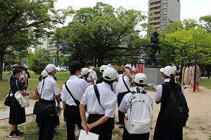 平和記念公園入口で派遣中学生とともに写真撮影