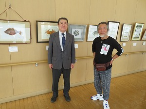 けやきプラザ第一ギャラリーで開催された「宇野隆 魚類画展」を訪問しました。星野市長は、展示された魚類画について、宇野さんから丁寧にご説明いただき、1点1点じっくりと観賞しました。