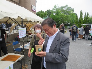 次に、あびこ農産物直売所あびこんで開催された創業祭を訪問しました。創業祭では、地元の農家さんによる軽トラ市(新鮮野菜の販売)が行われ、訪れた人たちでにぎわっていました。また、星野市長は、手賀沼の新名物「沼カレー」を試食しました。