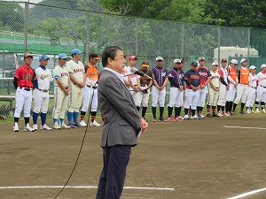 少年野球大会開会式で挨拶する星野市長