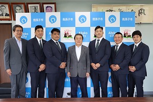 市内に練習拠点が あるラグビーチーム 「NECグリーンロケッツ東葛」の太田治ゼネラルマネ ジャーと亀山昇太郎選手、内川朝陽選手が今シーズンの結果報告のため星野市長を表敬訪問してくださいました。